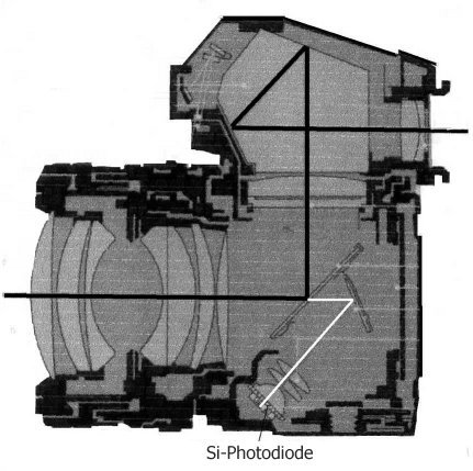 Nikon F3 stark mittenbetonte Messung mit Si-Fotodiode im Kameraboden. 80% der Messempfindlichkeit sind auf einen Messkreis von ca 12 mm Durchmesser konzentriert.