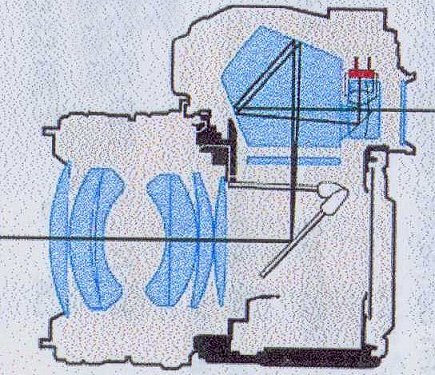 Nikon FA, Anordnung der 2 Si - Fotodioden am Okular, die die 5 Mess - Segmente erfassen und die Lage dieser Mess - Segmente im Bildfeld