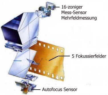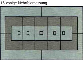 Die Anordnung des Mess - Sensors für eine 16 - zonige Mehrfeldmessung am Okular. Zentrale Position des Messfeldes ist das Fokussierfeld.